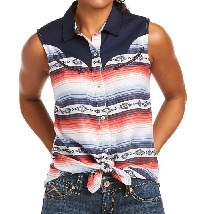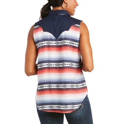 Just in time for the hot days of summer! The serape print is accented with an Aztec design. The front and back western yokes are eye catching in plain navy.