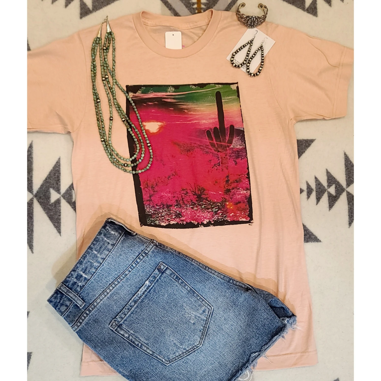 Doesn’t this tee just make you want to see a desert sunset? We just love the vibrant colors on this peach tee.