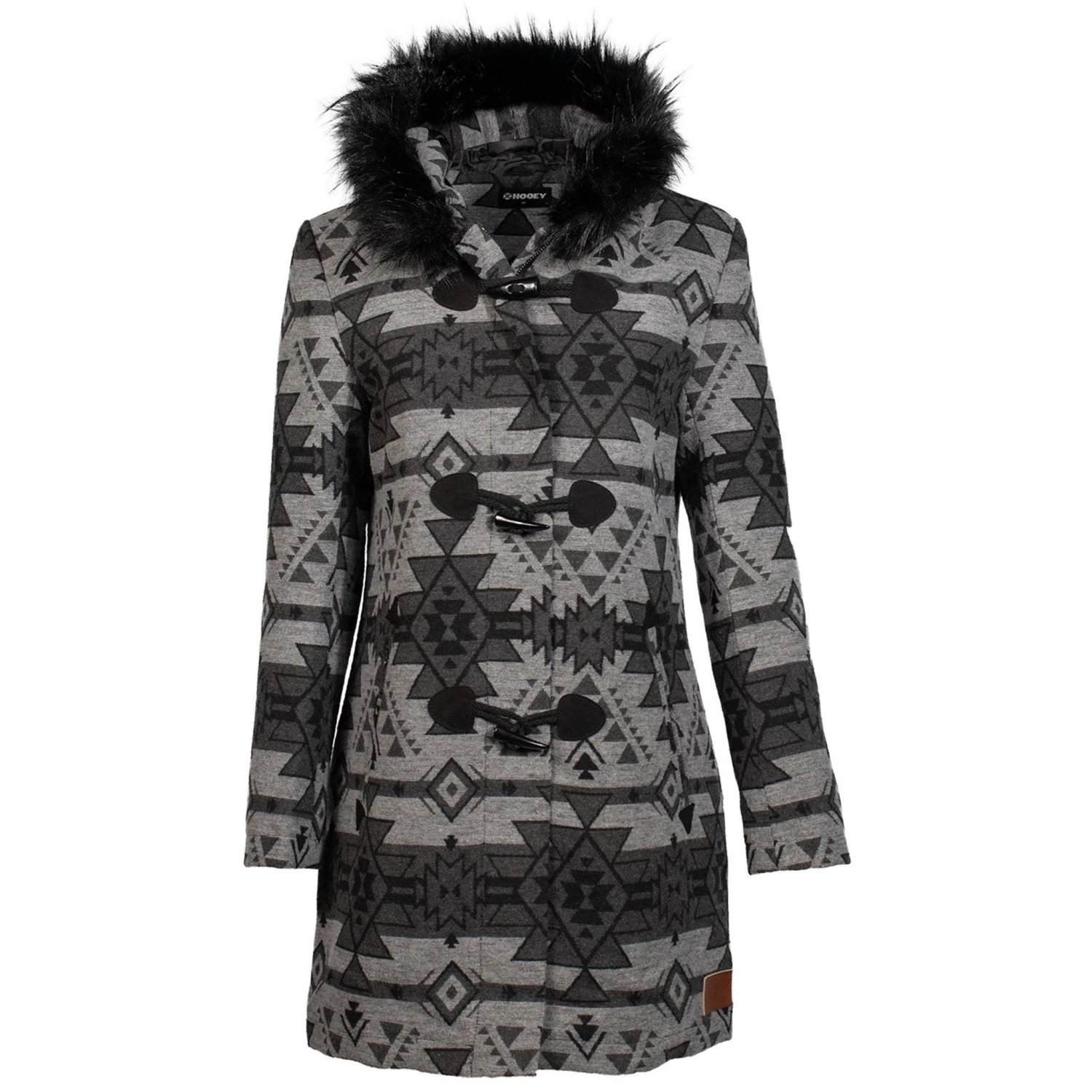 Hooey is offering this beautiful fitted ladies winter coat. Long length with three toggle closure and faux fur hood. Charcoal Aztec pattern throughout.