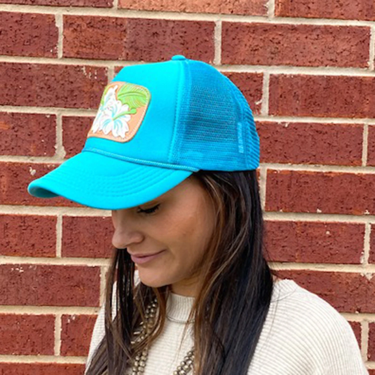 Show off your fun side this Spring & Summer, with this bright turquoise hibiscus Foam Cap!