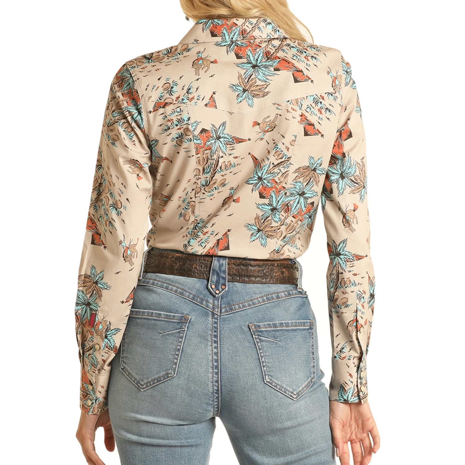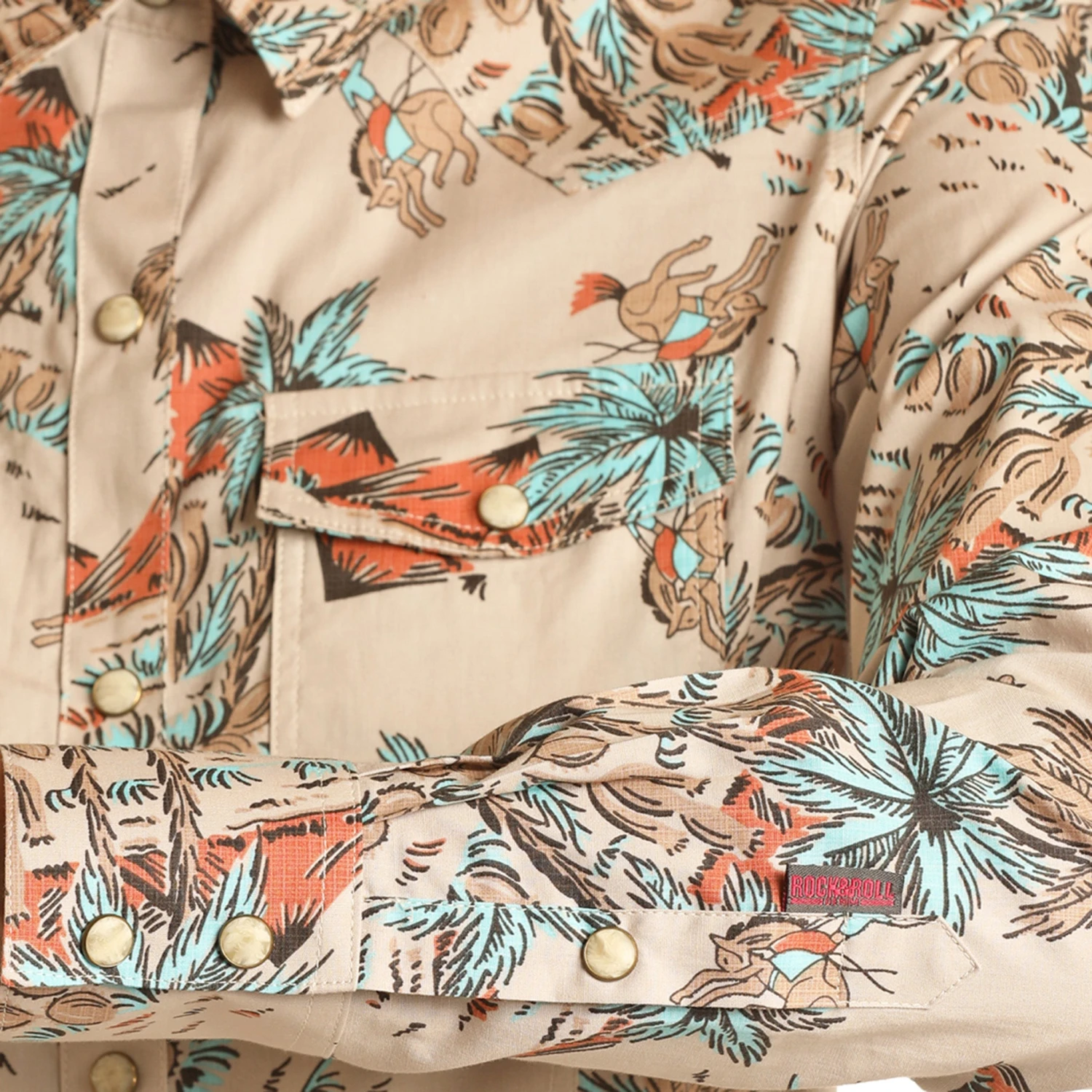 You get a little tropical attitude with this fun long sleeve shirt. This tan color will go great with just about anything!