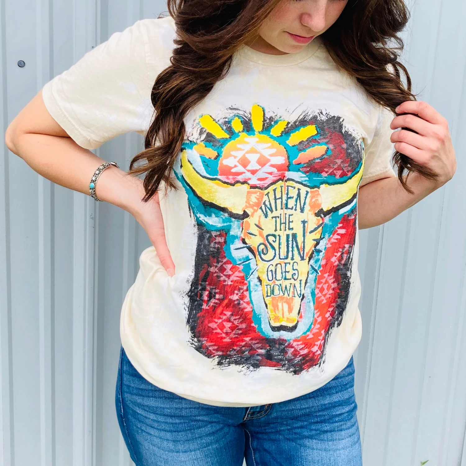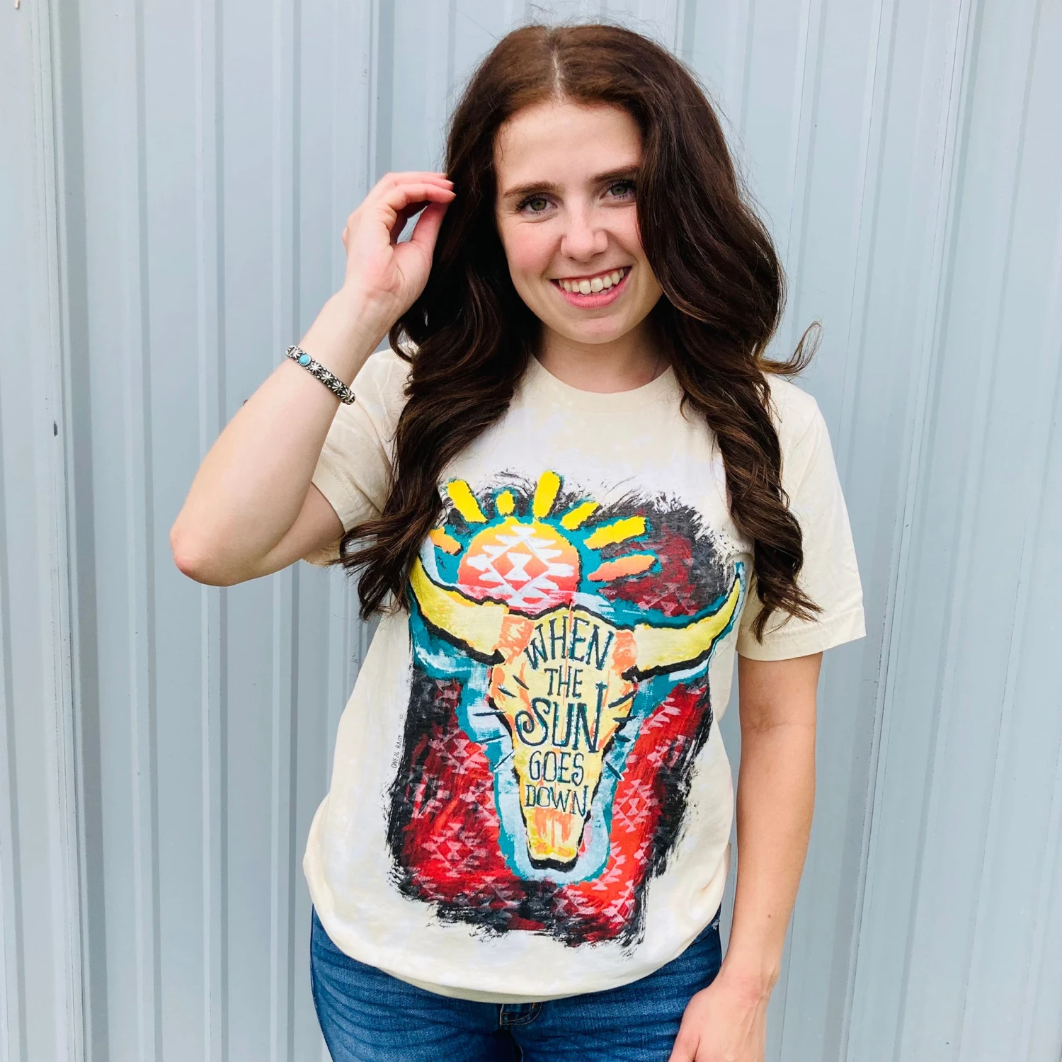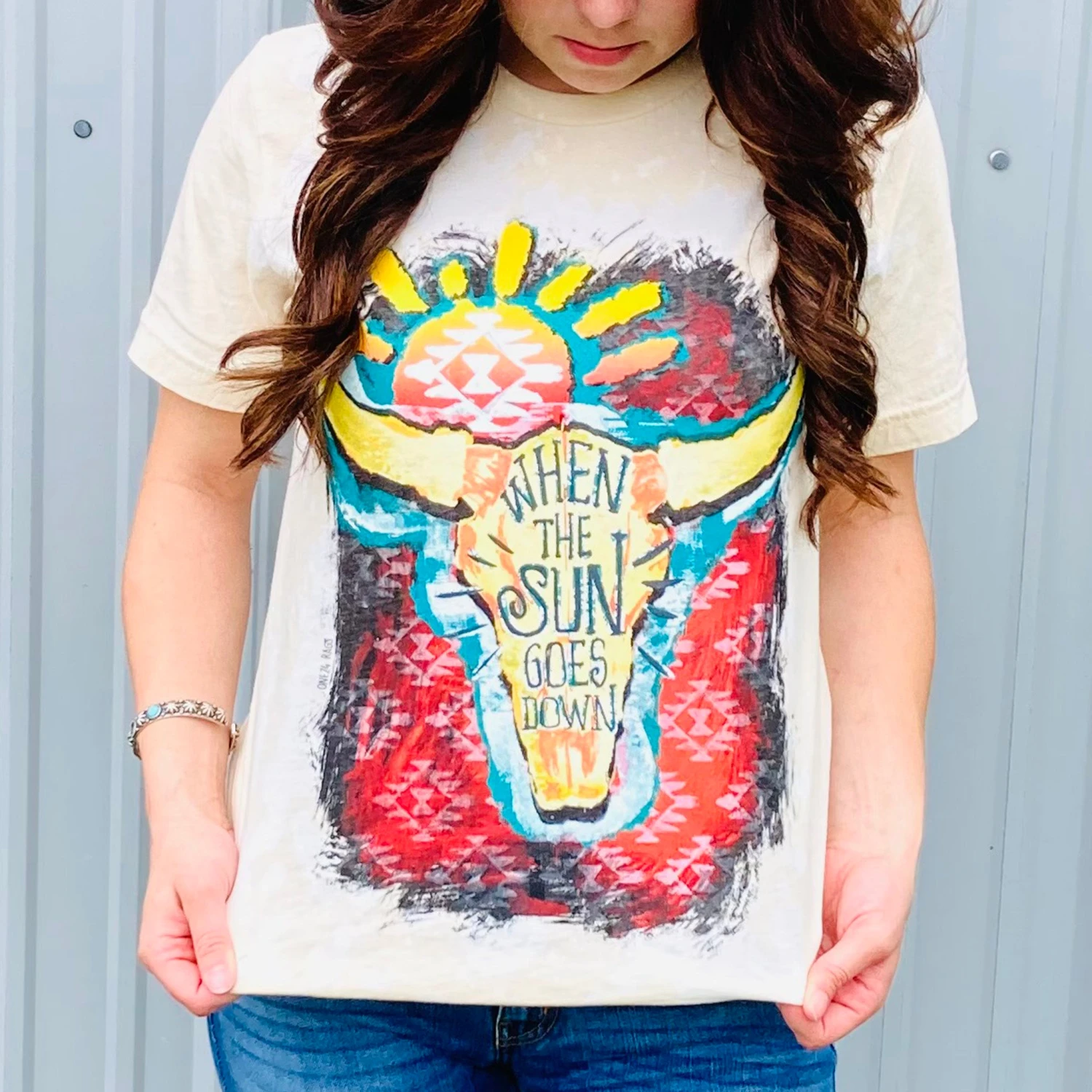 This “When the sun goes down” tee is so colorful with the steer head graphic on the front with a bright sun graphic popping out behind it.
