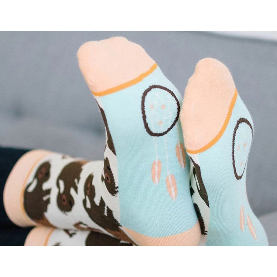 This women’s socks from Woven Pear feature bison throughout. The bottom of the feet have dream catchers on them.